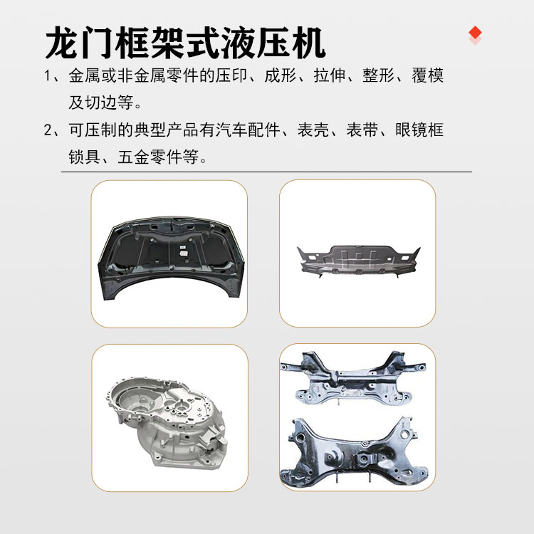 【產(chǎn)品描述】:30噸龍門框架式液壓機是一種高效、精準(zhǔn)的壓力成型設(shè)備,廣泛應(yīng)用于各種金屬、非金屬材料的壓制、成型和校正工藝中。其獨特的龍門框架設(shè)計和強大的液壓驅(qū)動系統(tǒng),使其具有出色的穩(wěn)定性和工作效率,成為現(xiàn)代工業(yè)生產(chǎn)中不可或缺的重要設(shè)備。 30噸龍門框架式液壓機采用高強度鋼材構(gòu)建龍門式框架,保證了設(shè)備的穩(wěn)固性和剛性。機身采用優(yōu)質(zhì)鋼板焊接而成,經(jīng)過精細的熱處